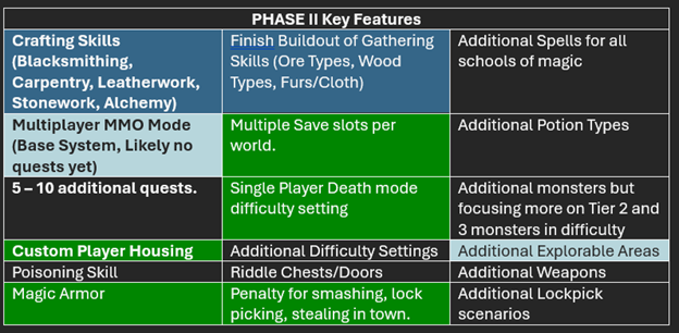 In the first five months of early access release, we have completed a number of items in green and partially implemented parts from the dark blue cells. I have also made it a priority to work on fixes/features that players have given me direct feedback on. From the table above my focus has been primarily on trying to knock out the bigger more difficult items from the list rather than focusing too much time on the smaller known features. While I am pleased with the progress overall, I think it will become important to have more explorable areas for players as I am now beginning work on MMO Multiplayer mode; so I will be making MMO multiplayer and adding some new explorable areas a priority over the next couple of months. This will also open an opportunity to do a couple more story quests for single player after that as I need some additional areas to finish the next batch of quests. MMO Multiplayer will take the majority of my focus over the two to three months however I will be doing some smaller updates from time to time with some of those being more explorable areas, more housing locations/accessories, and more monsters to battle. Once MMO Multiplayer is stable enough to start to allow smaller groups of players to experiment, I will be looking for players who are most interested in helping test it. If you have an interest please direct message me on discord for an opportunity to do this. The first round of testing I will probably only be taking five to ten interested users. From there we will gradually add more and more users until issues are at a minimum and we can open it up to everyone. |