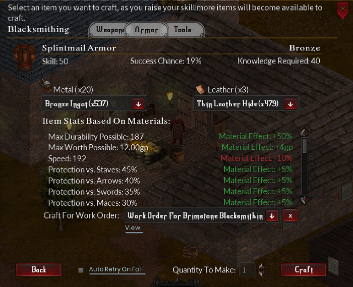 BlacksmithingBlacksmithing is a crafting skill that primarily makes use of metal to make weapons, armor, tools and other items. It’s best to pair it with the mining skill on your character so that you can mine metal, as you will quickly exhaust any purchased metal while you are raising your skill. To use the blacksmithing skill to start crafting items you will need to equip a smith’s hammer and find an anvil. Typically, you will find an anvil in or around blacksmith shops. Once you have found one, move close to it and double click on the anvil while you have the smith’s hammer equipped to your character. This will open a blacksmith crafting menu and allow you to select items you wish to craft. As you raise your blacksmithing skill, you will gain access to new items you can make. ![]() Materials It should also be noted the type of metal you work with also affects the skill requirements to craft an item as well as the knowledge required to work with that material. Different materials will also affect the color of crafted items as well as the item's stats such as damage and durability. All changes are shown upon selecting a material. When crafting an item you will be able to select the material(s) you wish to use. All blacksmithing items require at least metal but some items will require a secondary resource such as wood or leather. If a secondary resource is required then a dropdown will be present to select a resource. ![]() Tip: Leather may be obtained from hunting animals and some monsters. Wood can be obtained by chopping trees with the lumberjacking skill. Work Order SelectionYou may also, optionally, select a work order that you want to fill when crafting an item. When a work order is selected and you craft an item it will be checked to see if the item can be used against that work order prior to creation, once created it will automatically be used to fill the work order. You may also specify quantities of items you wish to craft and whether the item should automatically be reattempted on failure. Tip: When crafting items, you can positively affect durability of items by raising your character's intelligence. Smelting ItemsWhen you craft extra items that may not meet your needs or the quality requirements of a work order, you can put them back in the forge and smelt them down to get some of the metal back that the item is made of. |