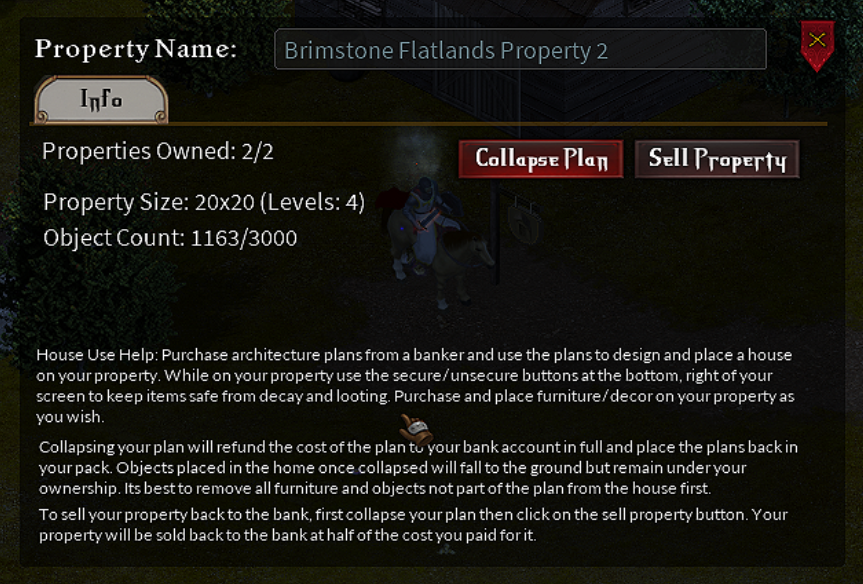 When the plan is collapsed, any non-container furnishings will be collapsed as well and left on the ground. Placement of locked items will remain but will fall to ground level. Finally, you will be refunded the full amount to your player bank account that was paid for the plan when built/placed. |