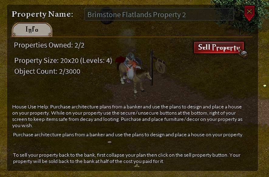 Selling Your PropertyYou can sell your property only if the structure on it has been collapsed, this can be done by double clicking on your property sign and clicking the sell button. Note: once you sell the property, any items or furnishings left on the property will be immediately disposed of, so you should remove anything you want to keep.