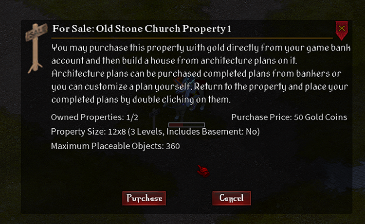 Purchasing a property will be bulk of the cost to owning a property, the cost is always paid from a player’s bank and never from their inventory. In MMO Multiplayer mode, properties also require taxes be paid on them every so many game days (typically 90). The purpose of taxes is to make sure accounts that have gone dormant over long periods of time do not unfairly consume housing properties for active players. Note: Any player may own a maximum of two properties at a time. This will eventually be a setting in single player settings for your world. |
